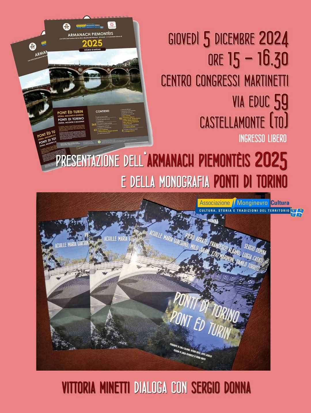 Presentazione dell'Armanach Piemontèis 2025 e della monografia "Ponti di Torino" - Vittoria Minetti dialogherà con Sergio Donna - Giovedì 5 dicembre 2024 ore 15.00/16.30 presso il Centro Congressi "Piero Martinetti"