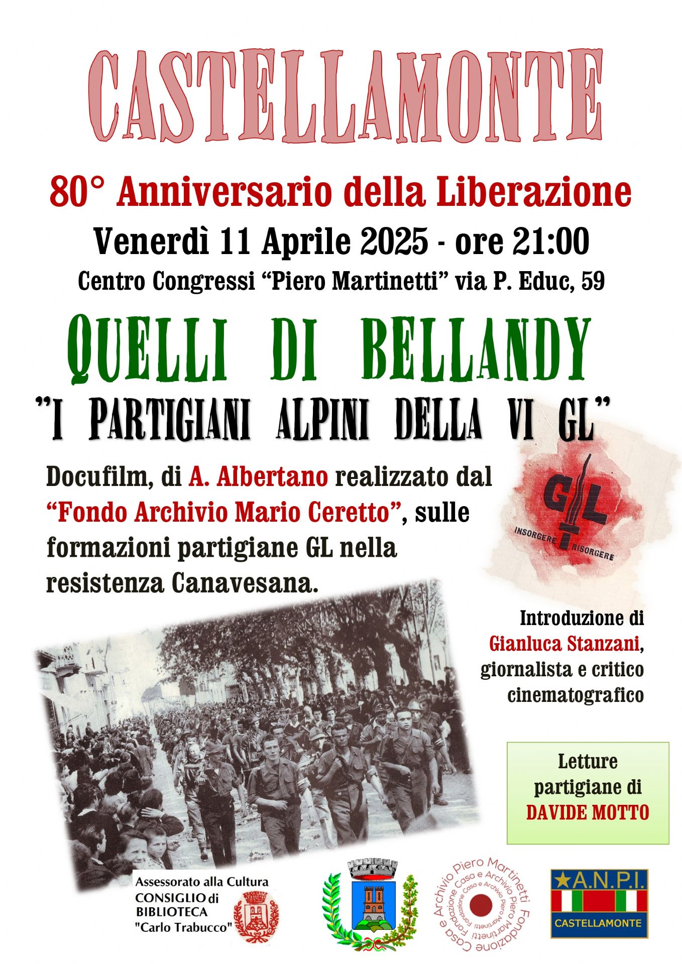 80° Anniversario della Liberazione - "Quelli di Bellandy" Docufilm di A. Albertano realizzato dal "Fondo Archivio Mario Ceretto - Venerdì 11 aprile 2025 ore 21.00 Centro Congressi Martinetti