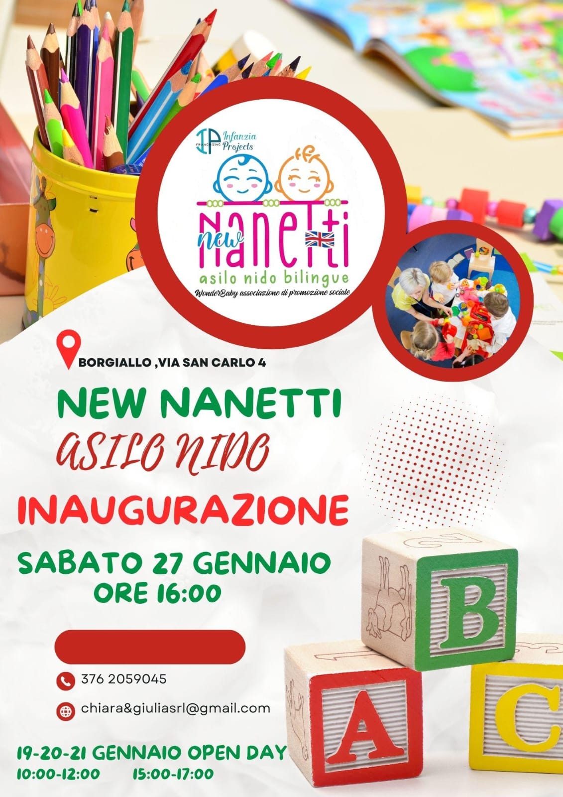 Un caro saluto a tutti ed una buona notizia per il nostro Comune ed il suo sviluppo. Il nostro Nido riparte con una nuova gestione entusiasta ed innovativa. Diventa una struttura bilingue che in collaborazione con il British di Torino avrà una educatrice di madre lingua inglese... e questa è la prima novità. Poi avrà un servizio trasporto per i bimbi più lontani e molto altro. E appena completate le pratiche burocratiche potrà accogliere anche bambini più grandi. Gli spazi ci sono ed il Comune con fondi del PNRR sta provvedendo a importanti migliorie. Per vostra maggiore informazione vi trasmetto le locandine.