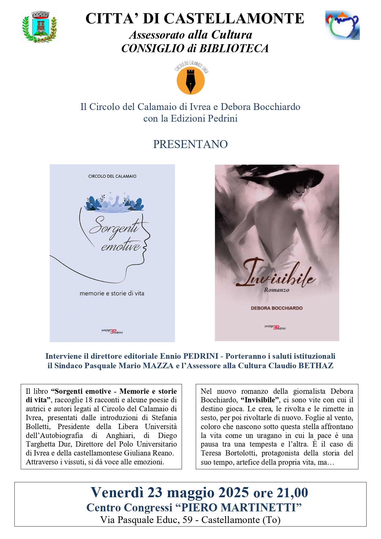 Presentazione del libro "Sorgenti emotive - Memorie e storie di vita" a cura del Circolo del Calamaio di Ivrea e del romanzo "Invisibile" di Debora Bocchiardo - Venerdì 23 maggio 2025 ore 21,00 Centro Congressi Martinetti