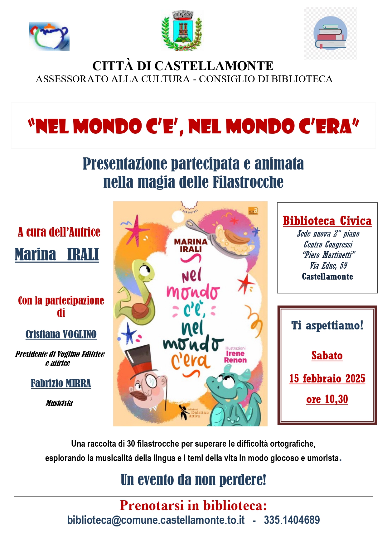 "Nel mondo c'è, nel mondo c'era": presentazione partecipata e animata nella magia delle Filastrocche - A cura dell'autrice Marina Irali - Sabato 15 febbraio 2025 ore 10,30 - Prenotarsi in Biblioteca.