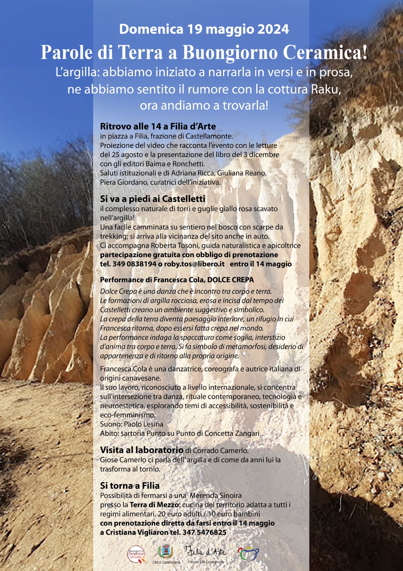 Domenica 19 Maggio 2024 dalle ore 14.00 Ritrovo a Filia d'Arte - Castelletti - Performance di Francesca Cola - Visita al laboratorio di Corrado Camerlo - Merenda Sinoira presso Terra di Mezzo