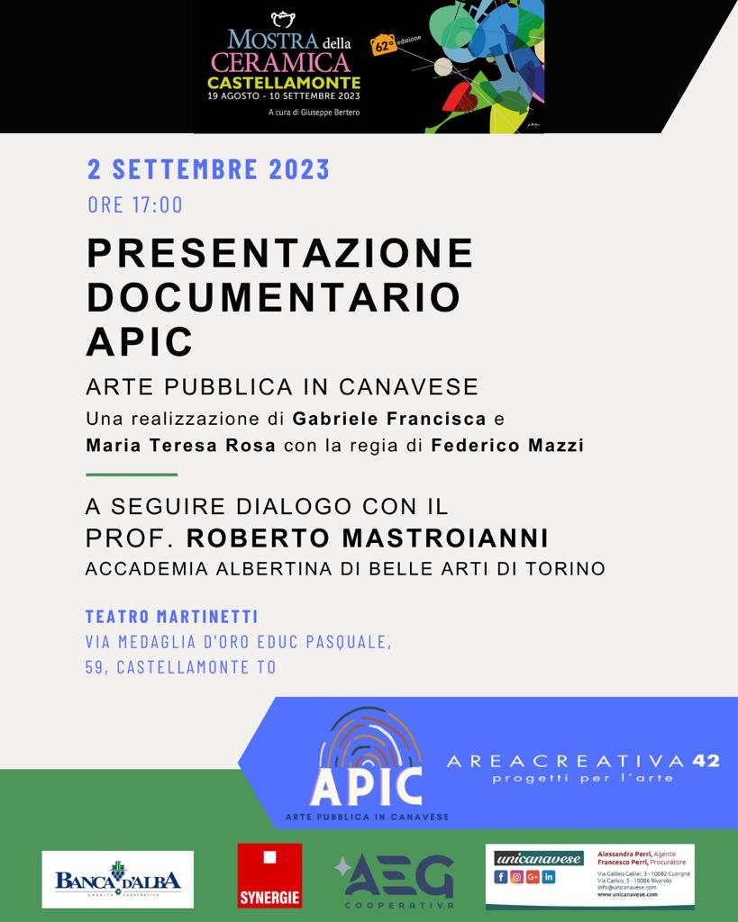 Sabato 2 settembre 2023 alle ore 17,00 presso il Centro Congressi "Martinetti" - Via Educ, 59, - presentazione documentario APIC - Arte Pubblica in Canavese, una realizzazione di Gabriele Francisca e Maria Teresa Rosa con la regia di Federico Mazzi, a seguire dialogo con il Prof. Roberto Mastroianni dell'Accademia Albertina di Belle Arti di Torino.