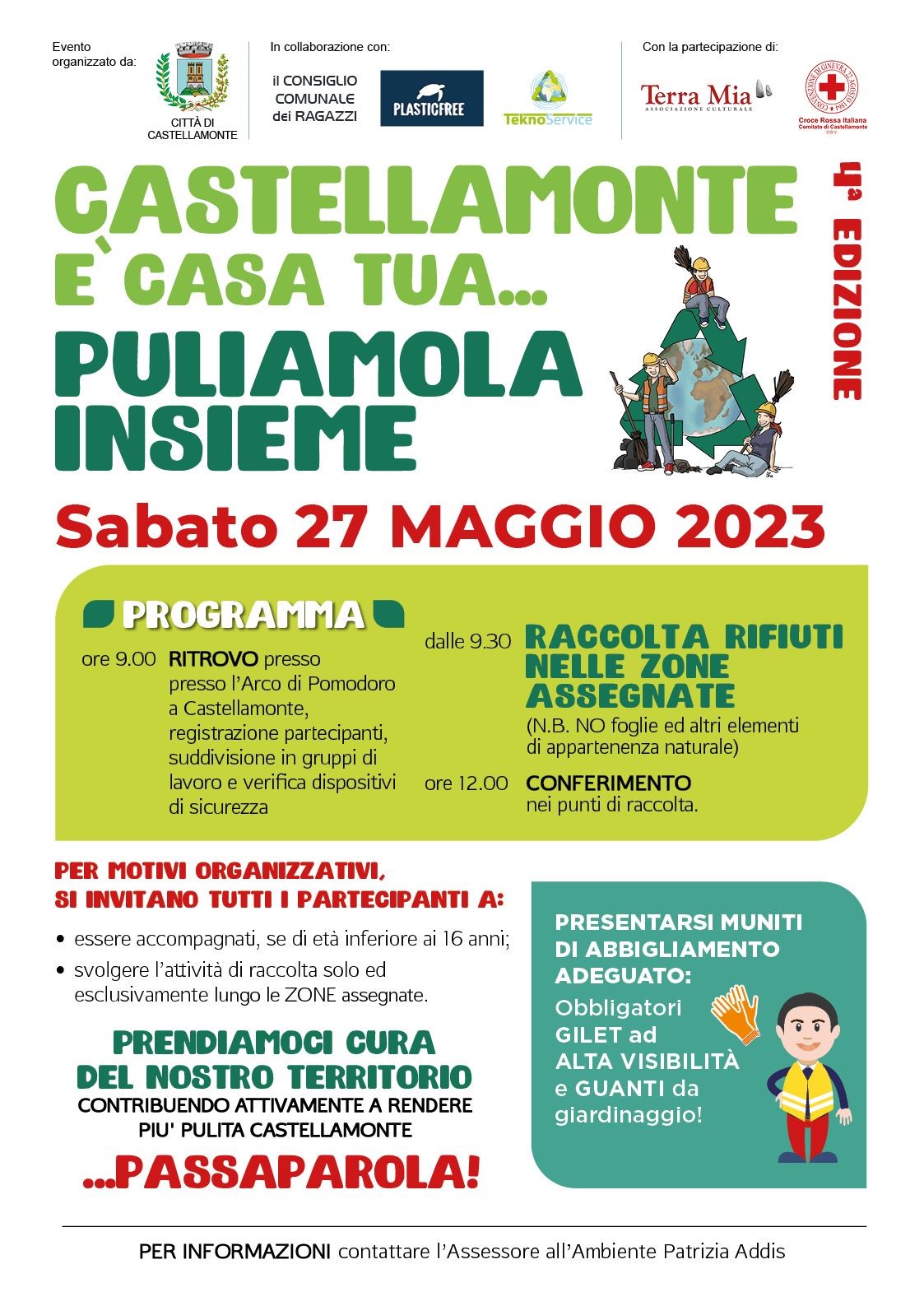 L’Amministrazione comunale, in collaborazione con Plasticfree, Teknoservice e il Consiglio comunale dei ragazzi, con la partecipazione di “Terra mia” e “Croce Rossa Castellamonte”, rende noto che nella mattinata di sabato 27 maggio verrà realizzata una giornata ecologica nel concentrico del Comune di Castellamonte. L'iniziativa arriva come risposta alle continue segnalazioni di abbandono di rifiuti, soprattutto mozziconi e cartacce, nel bellissimo concentrico della città della ceramica.
