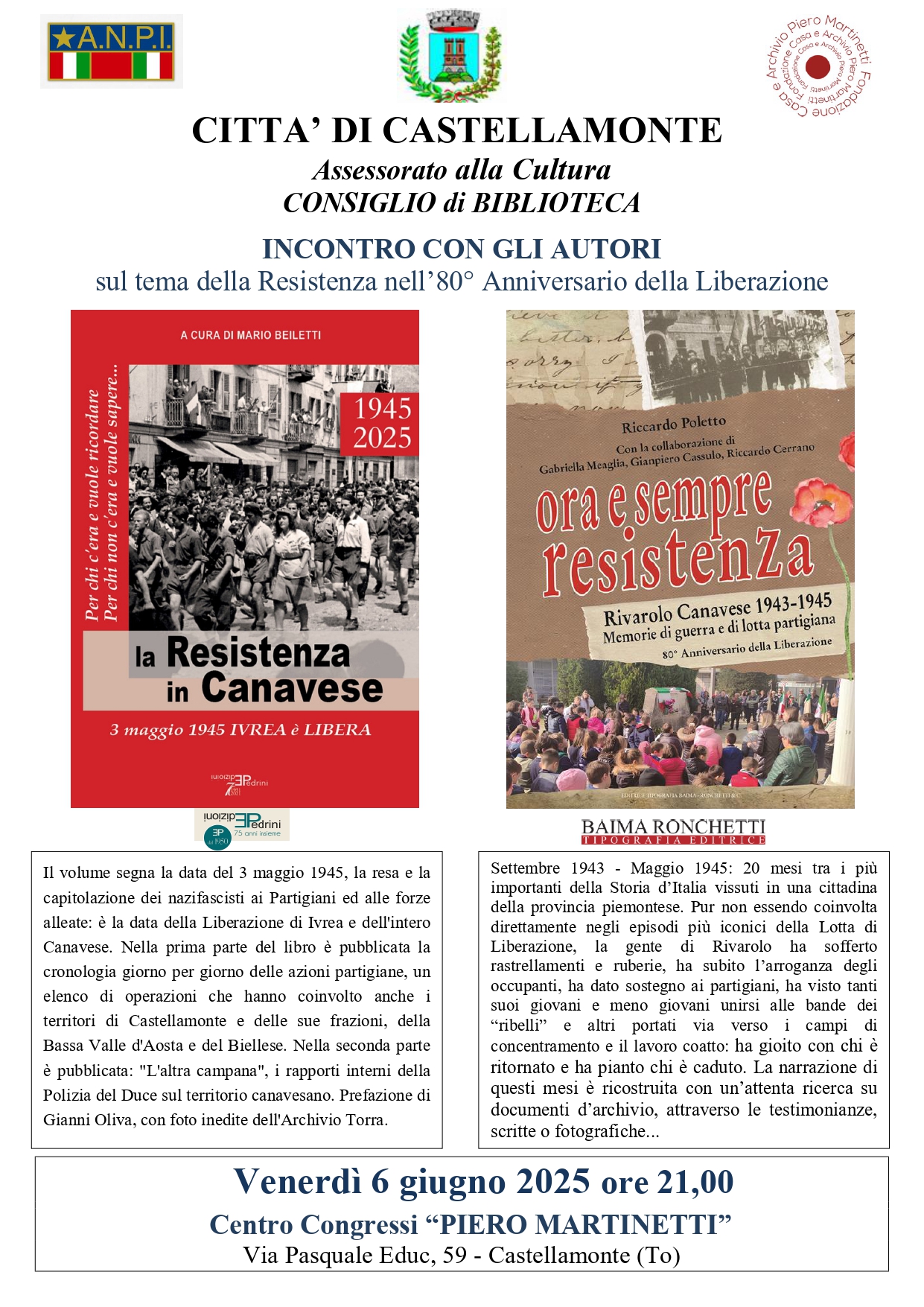 Presentazione di due libri sulla Resistenza in occasione dell'80° anniversario della Liberazione: Mario Beiletti "La Resistenza in Canavese" e Riccardo Poletto "Ora e sempre Resistenza" - Venerdì 6 giugno 2025 alle ore 21,00 Centro Congressi Martinetti