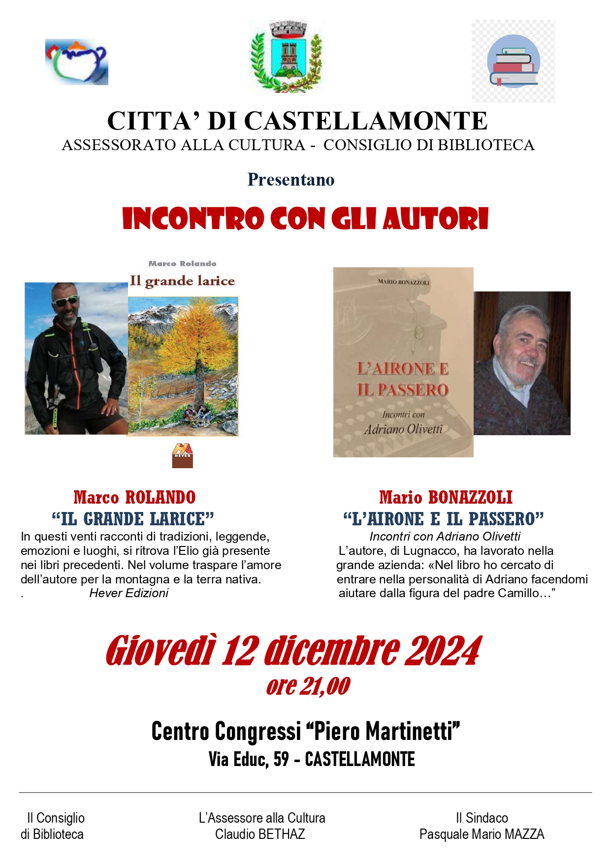 Marco Rolando con "Il grande larice" e Mario Bonazzoli con "L'airone e il passero - Incontri con Adriano Olivetti" - Centro Congressi Piero Martinetti - Giovedì 12 dicembre ore 21,00