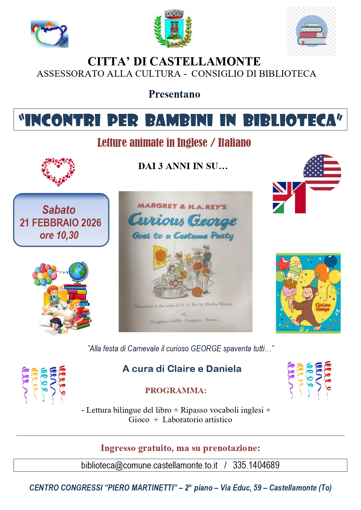 Una storia della scimmietta George ad una festa di Carnevale - Sabato 21 febbraio ore 10,30 in Biblioteca - Ingresso gratuito su prenotazione