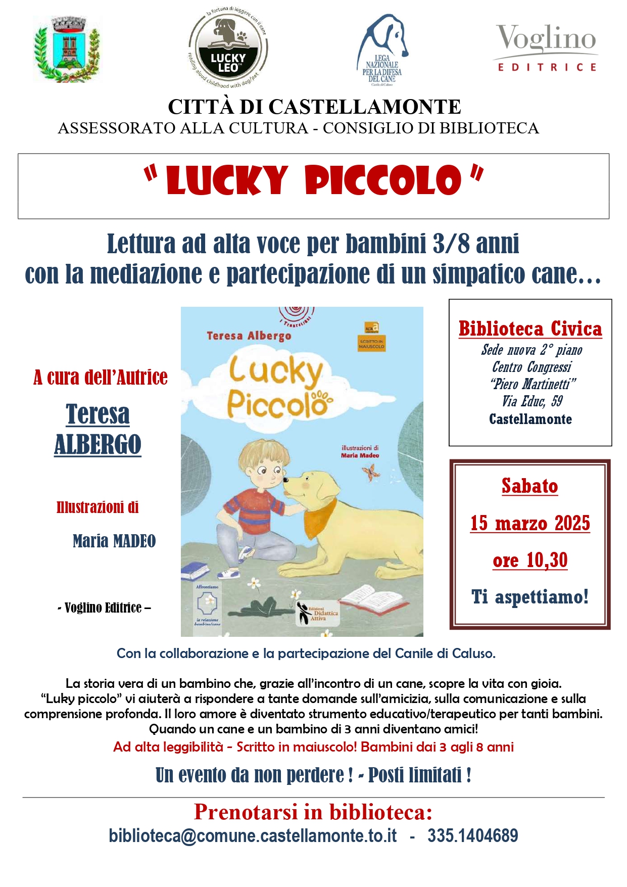"Lucky piccolo" lettura ad alta voce per bambini 3/8 anni con la mediazione e partecipazione di un simpatico cane... - A cura dell'autrice Teresa Albergo - Prenotarsi in Biblioteca - Posti limitati