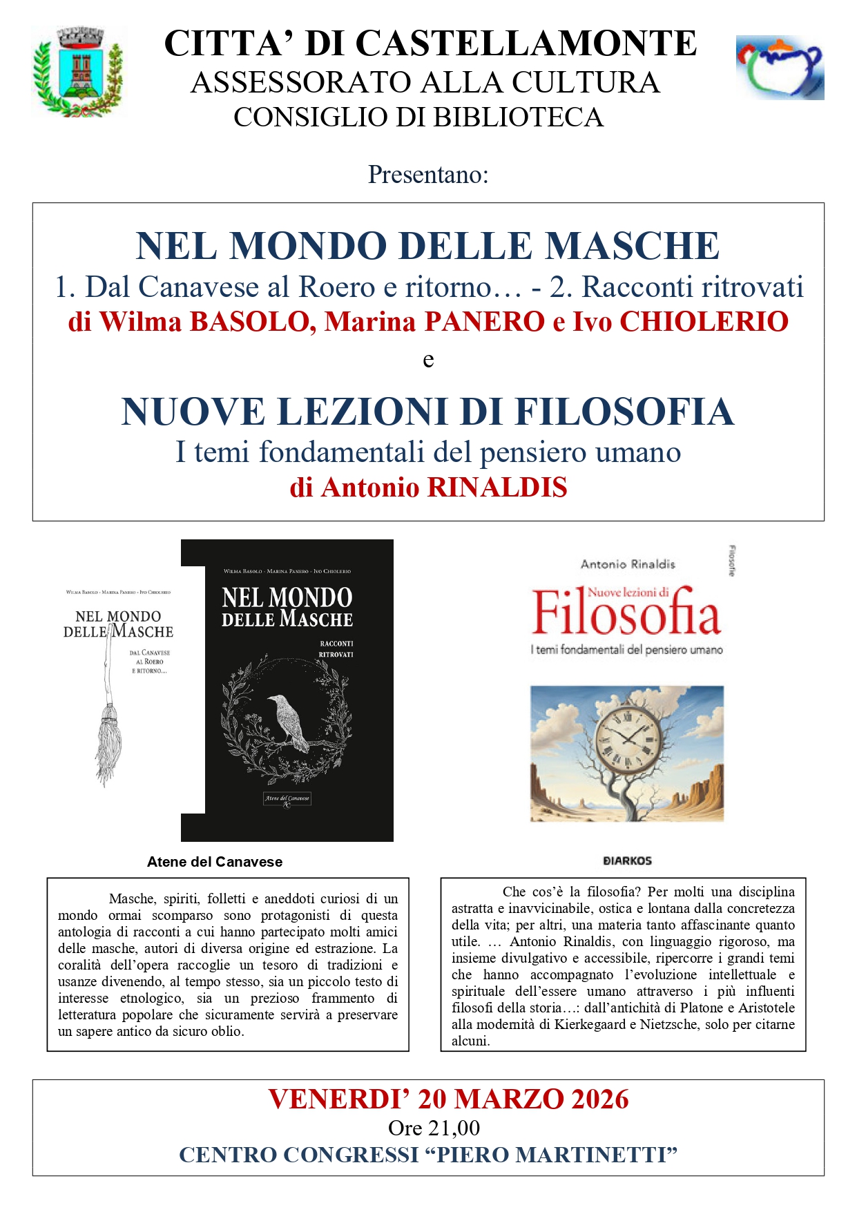 "Nel mondo delle Masche" 1/2 (Basolo, Panero, Chiolerio) e "Nuove lezioni di Filosofia" (Rinaldis): Centro Congressi "Piero Martinetti" ore 21,00 Venerdì 20 marzo 2026